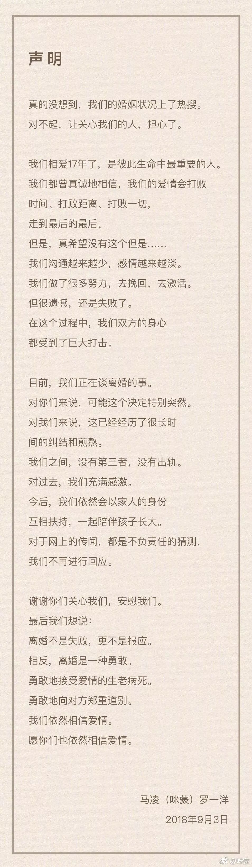 仔细看看咪蒙的这份离婚声明,可以发现一件事情。他们离婚的原因,其实很简单: