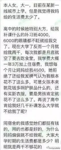 不久前的一个女大学生求助帖让人印象深刻,一位女大学生因为母亲给不足自己想要的4500生活费而在网络上公开吐槽自己的母亲。
